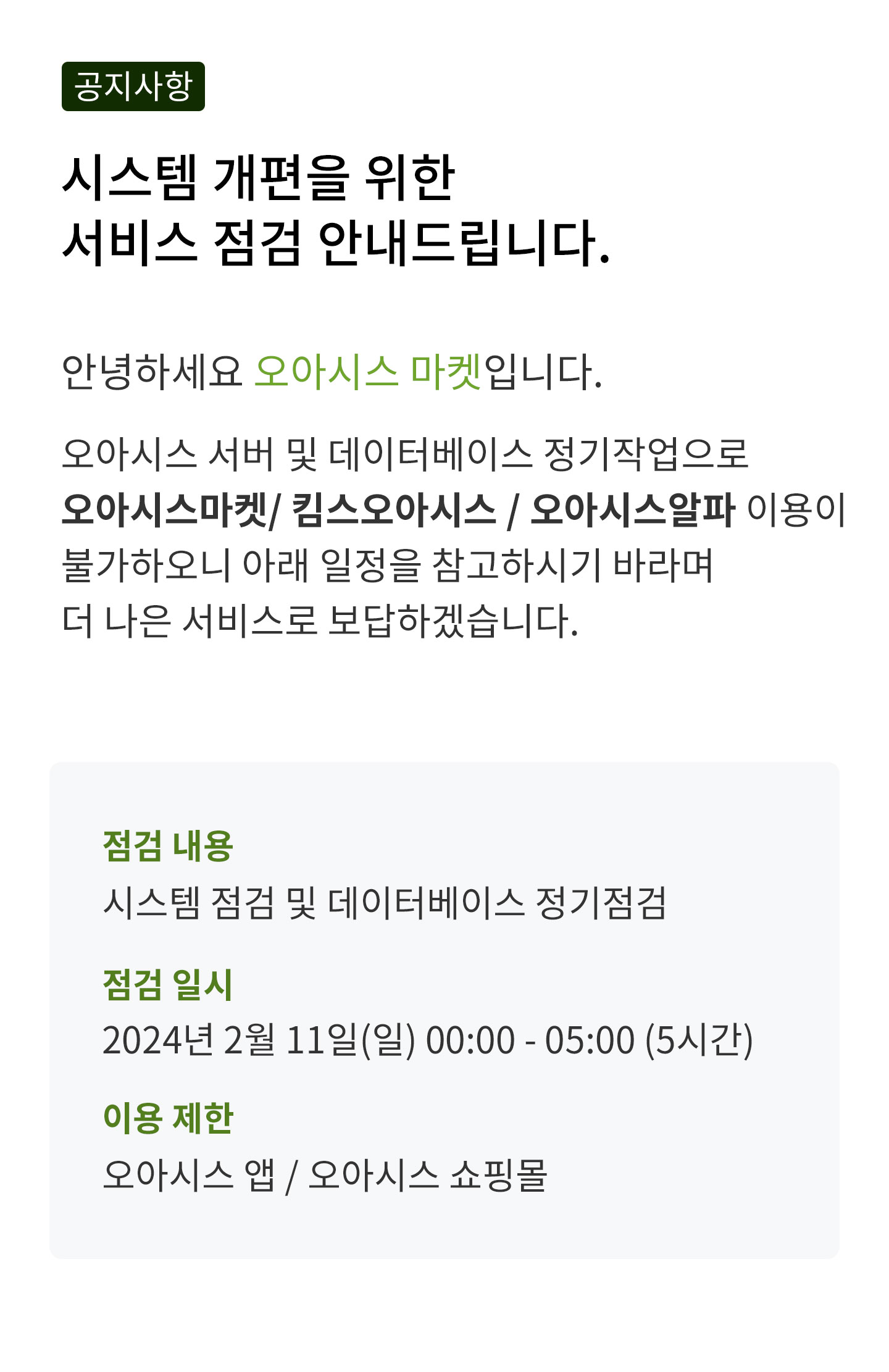 [공지]⠀오아시스 서비스 점검 안내 [2024년 02월 11일(일) 00:00 - 05:00 (5시간)]