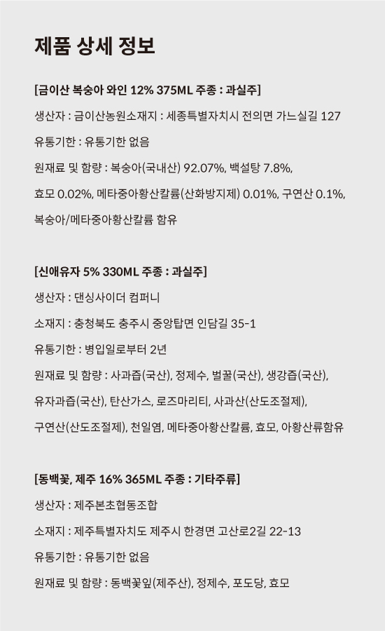 금이산 복숭아 와인 : 복숭아(국내산) 92.07%, 백설탕 7.8%, 효모 0.02%, 메타중아황산칼륨(산화방지제) 0.01%, 구연산 0.1%, 복숭아, 메타중아황산칼륨 함유 신애유자 : 사과즙(국산), 정제수, 벌꿀(국산), 생강즙(국산), 유자과즙(국산), 탄산가스, 로즈마리티, 사과산(산도조절제), 구연산(산도조절제), 천일염, 메타중아황산칼륨, 효모, 아황산류함유 제주,동백 : 동백꽃잎, 정제수, 포도당, 적채(제주산), 효모