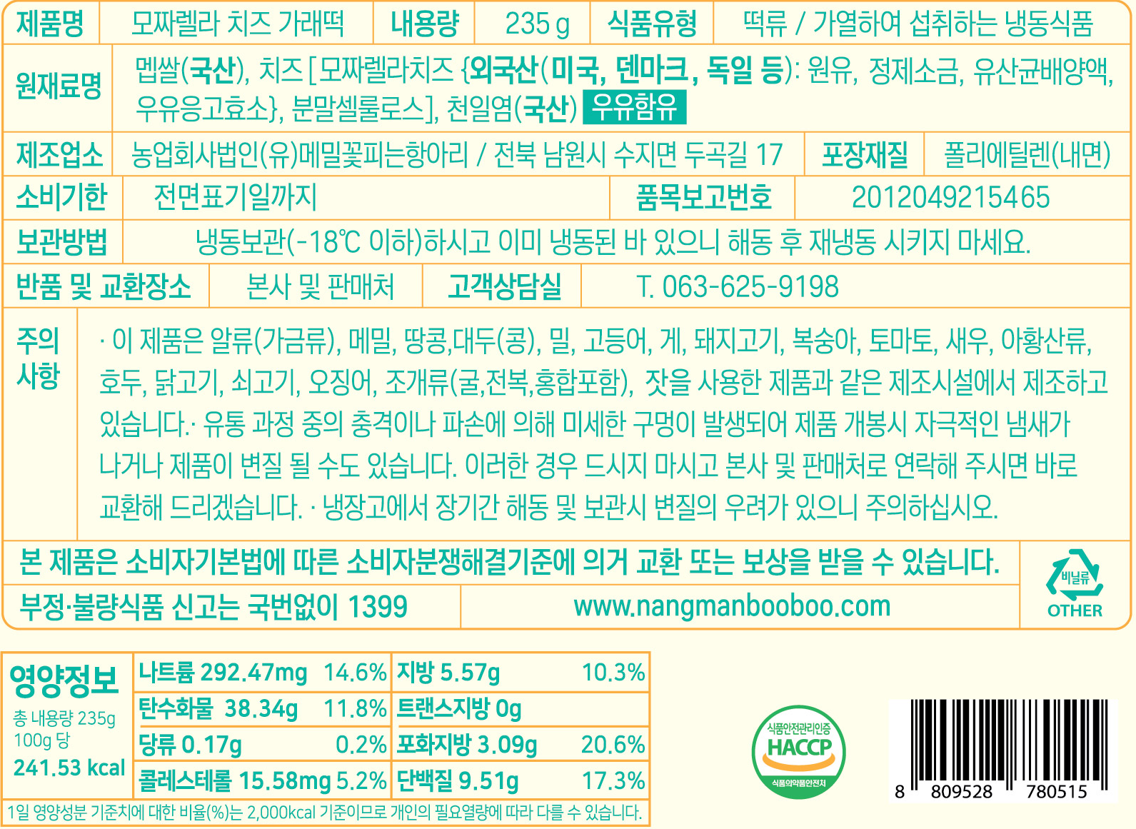멥쌀(국산), 치즈[모짜렐라치즈 {외국산(미국, 오스트리아, 독일 등):원유, 정제소금, 유산균배양액, 우유응고효소}, 분말셀룰로스], 천일염(국산) *우유함유