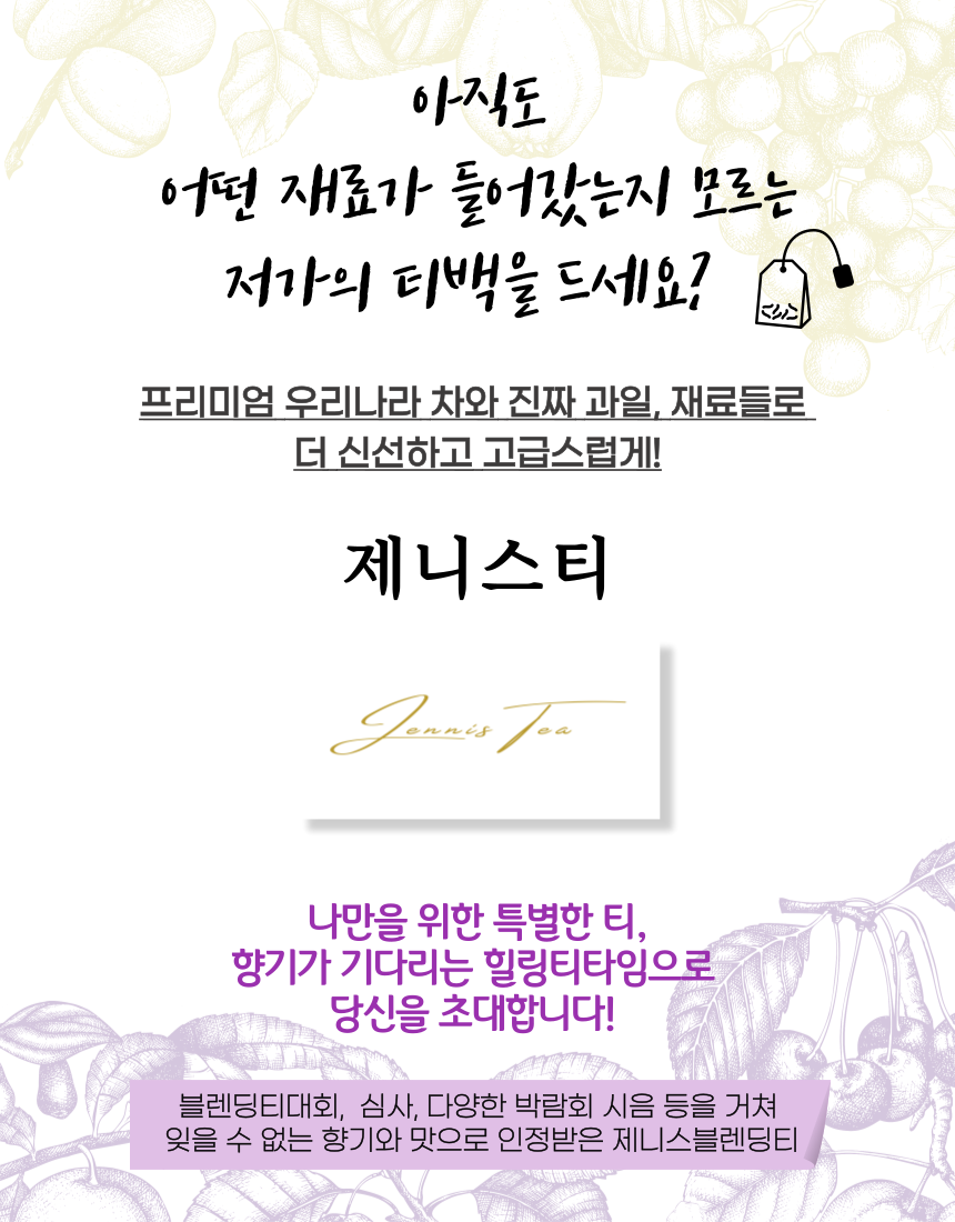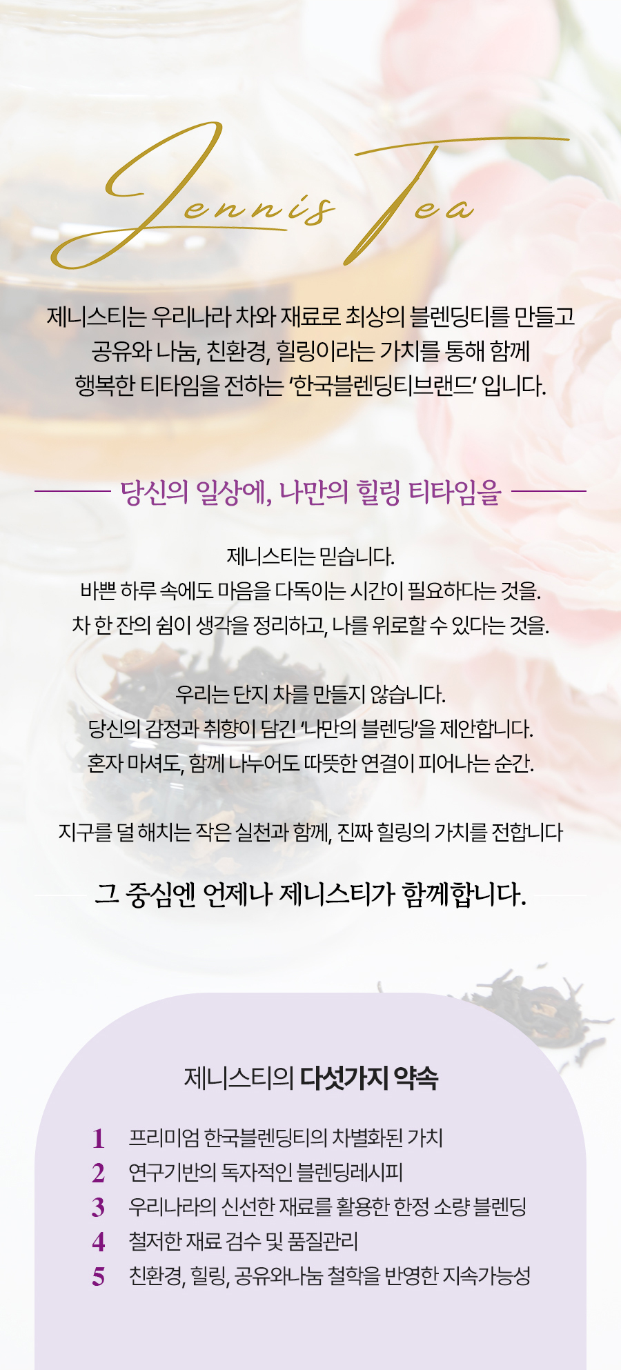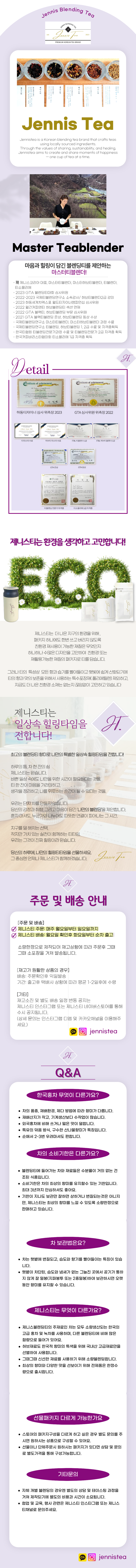 | 유기농인증을 받은 우리나라 보성홍차를 사용한 블렌딩티, GTA 수상과 심사위원 경력을 바탕으로 만든 전문 우리나라 블렌딩티, 친환경을 생각하는 디자인과 패키지 사용 |
