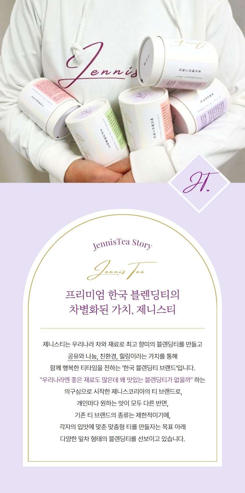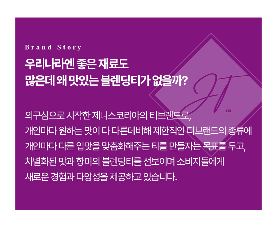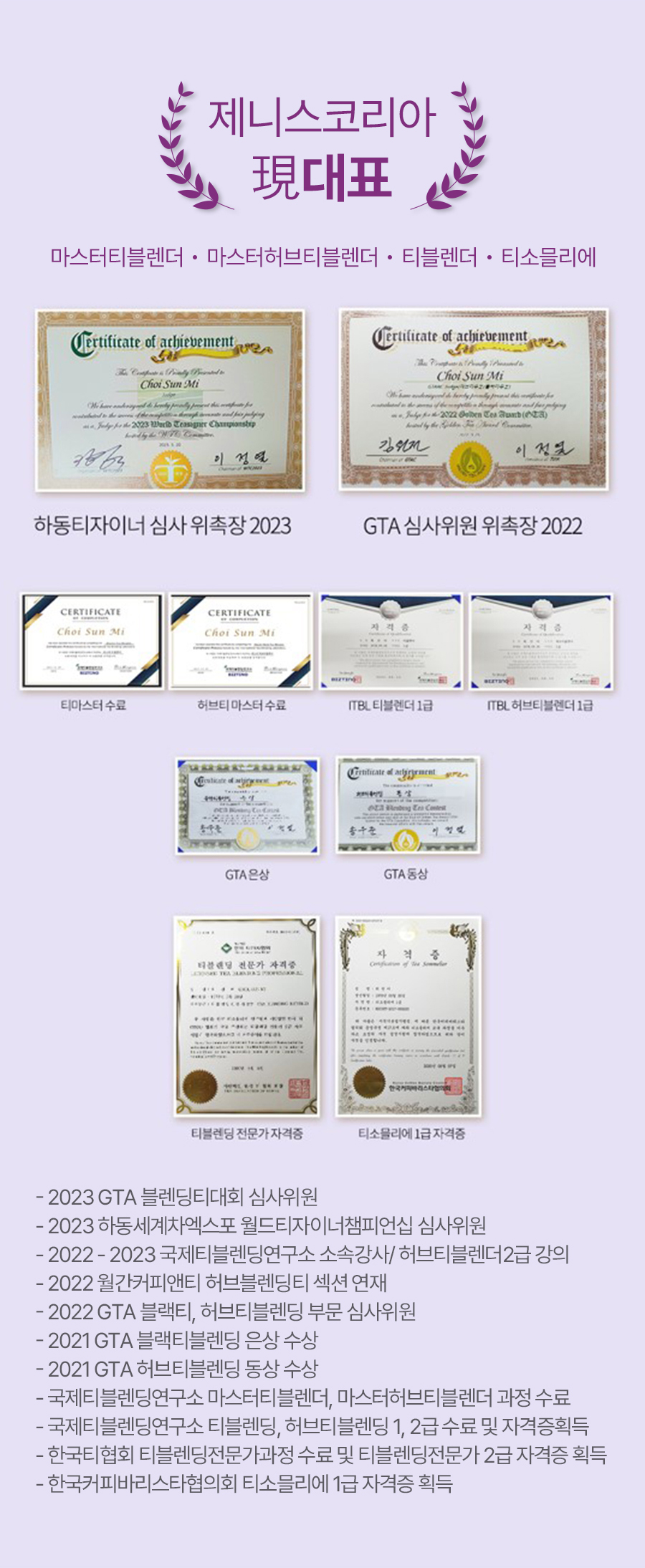 | 유기농인증을 받은 우리나라 보성홍차를 사용한 블렌딩티, GTA 수상과 심사위원 경력을 바탕으로 만든 전문 우리나라 블렌딩티, 친환경을 생각하는 디자인과 패키지 사용 |