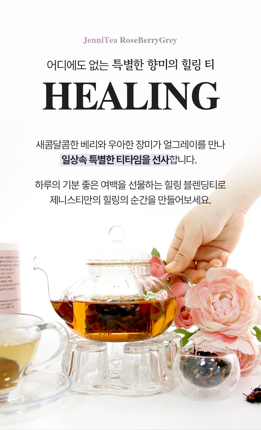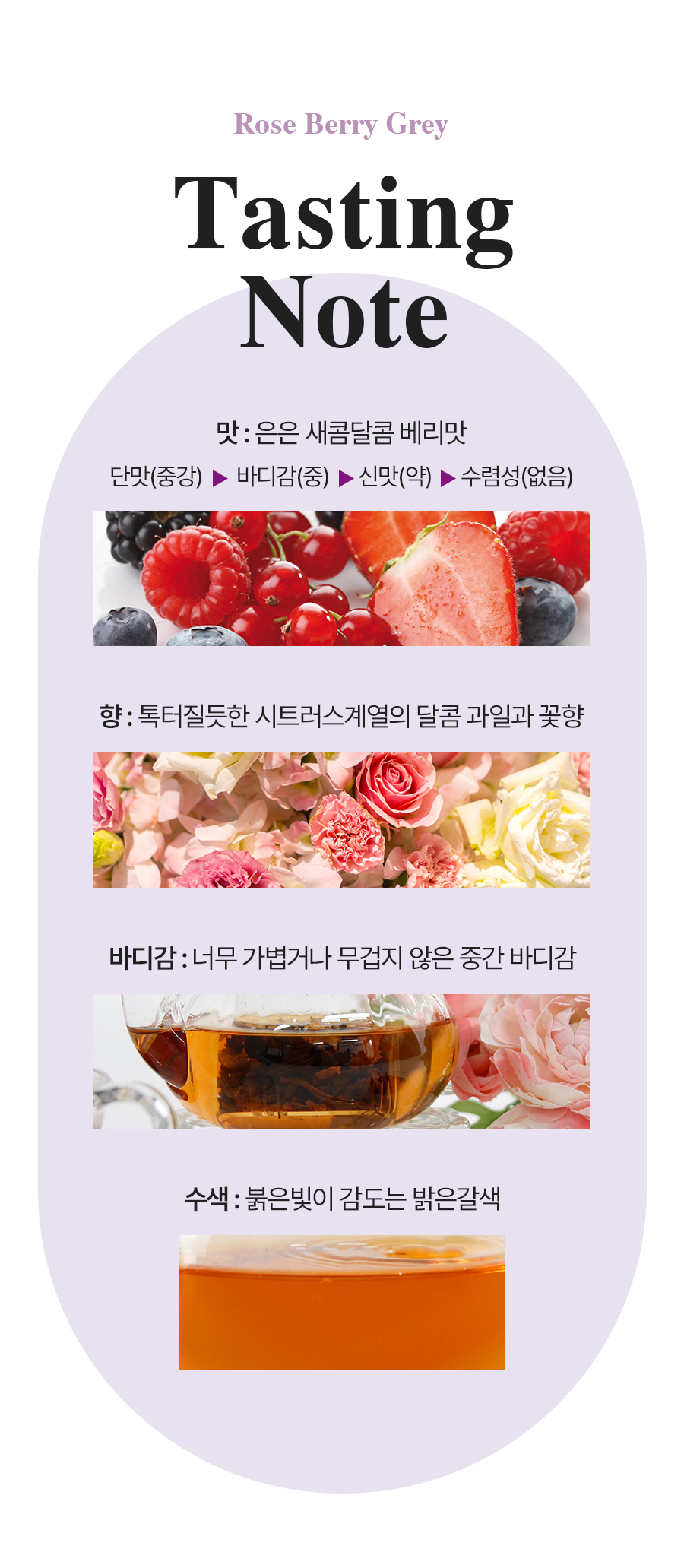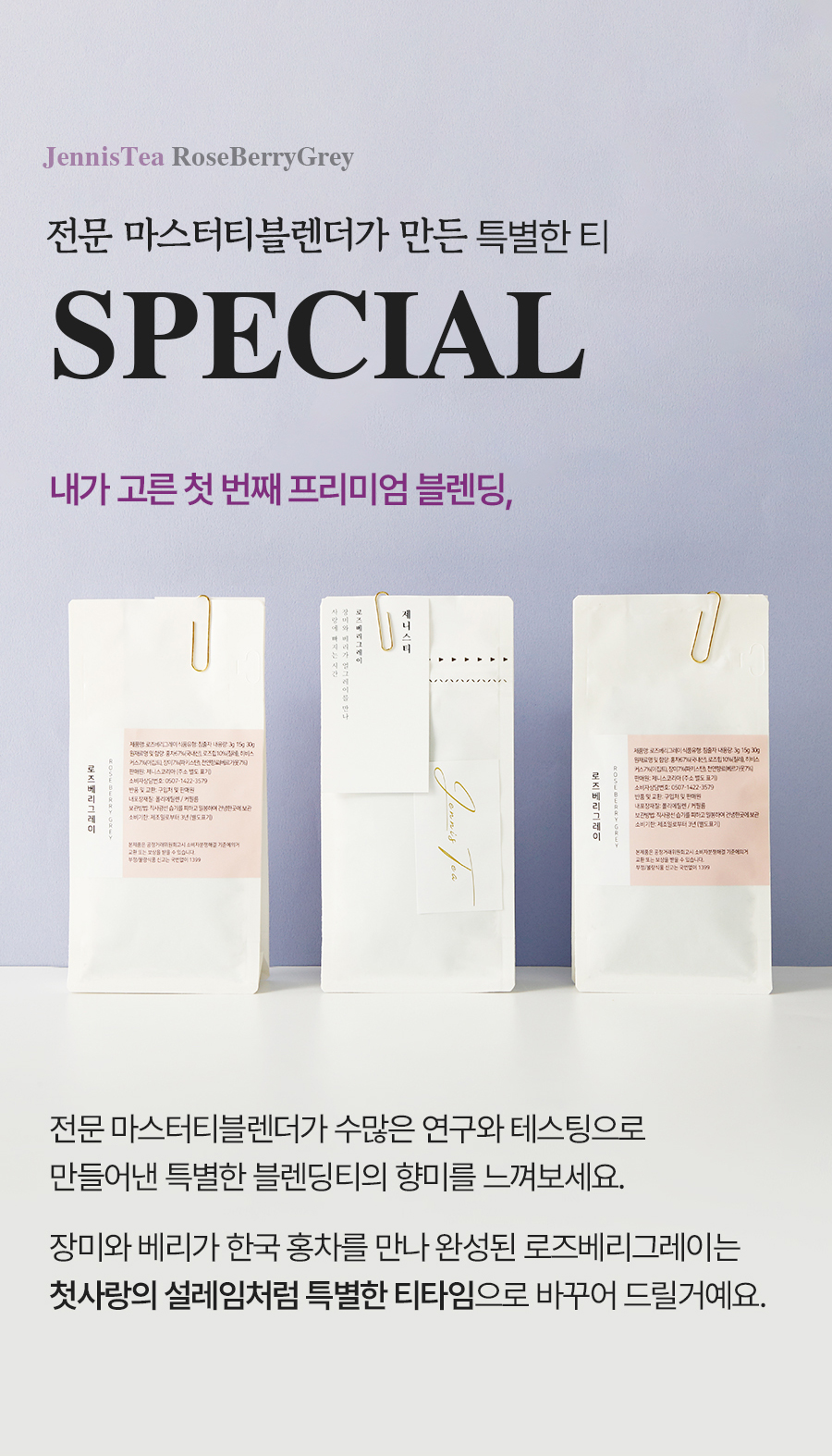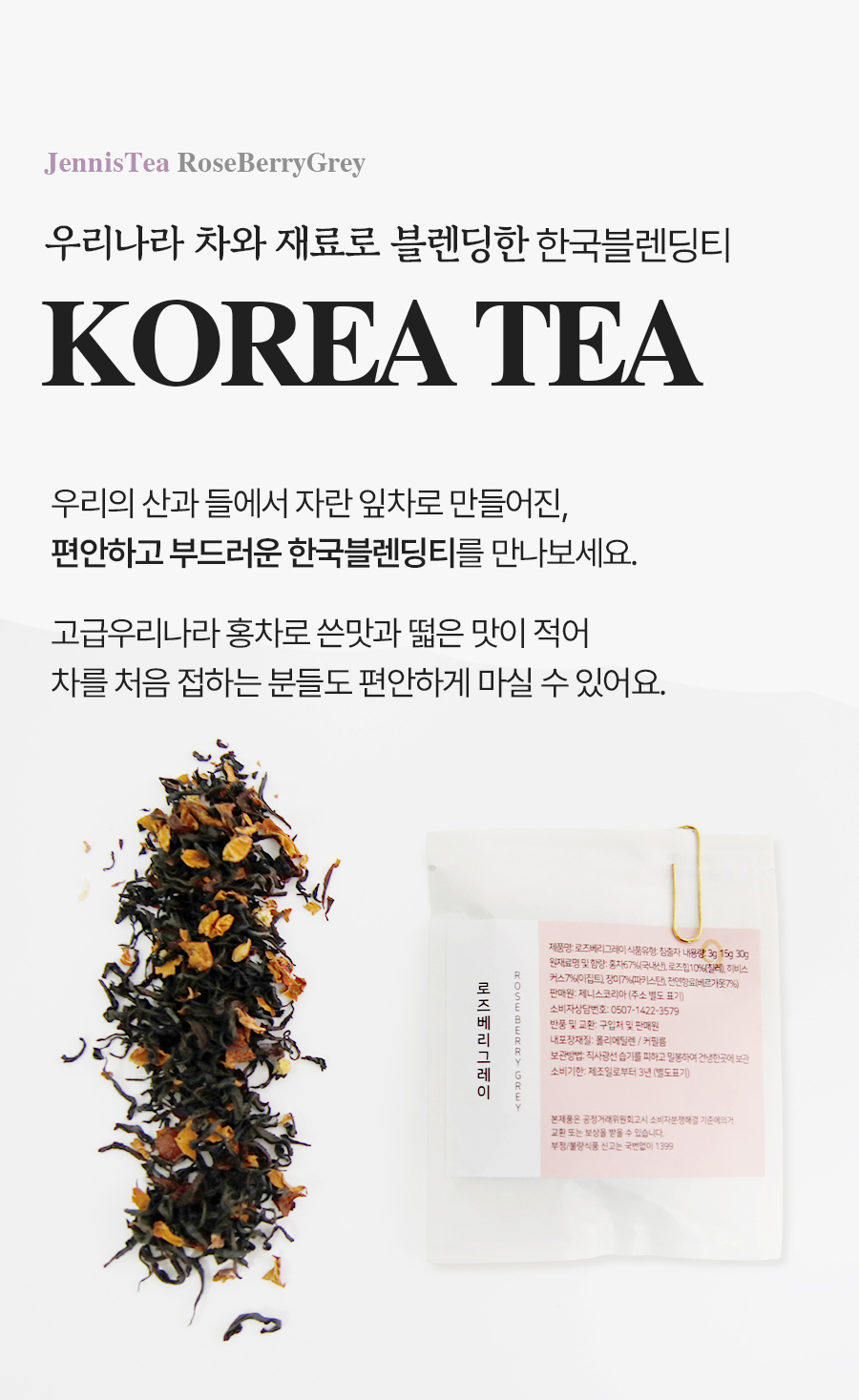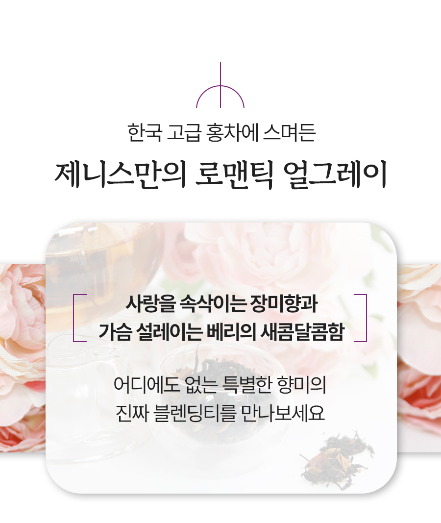 누구나 사랑하는 얼그레이에서 착안하여 만든 블렌딩티로 제니스만의 얼그레이 시리즈가 만들어졌습니다. 그 중 첫번째 로즈베리그레이는 우리나라 청정재배지역인 보성에서 자란 유기농 찻잎으로 만든 홍차를 베이스로 은은한 향의 장미, 새콤달콤함의 히비스커스와 로즈힙이 블렌딩되어 얼그레이스러우면서도 은은 새콤달콤함이 묻어나 그 어느 곳에서도 맛 볼 수 없는 우리나라와 제니스만의 얼그레이 홍차가 되었습니다. 내안의 잊고 있었던 첫사랑의 설렘을 깨워주는 블렌딩티로, 어느 순간 내안에서 서서히 물든 사랑의 시작과 순간을 떠올릴 수 있습니다. |