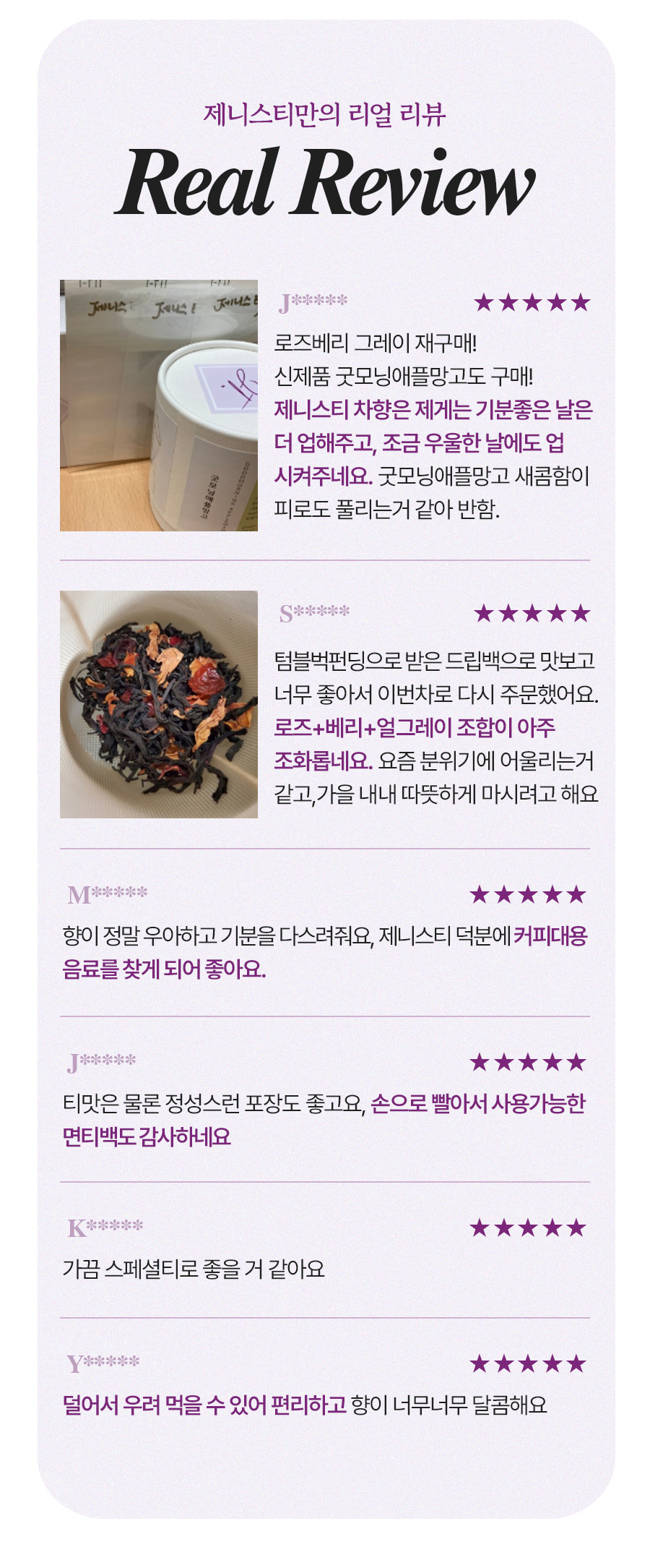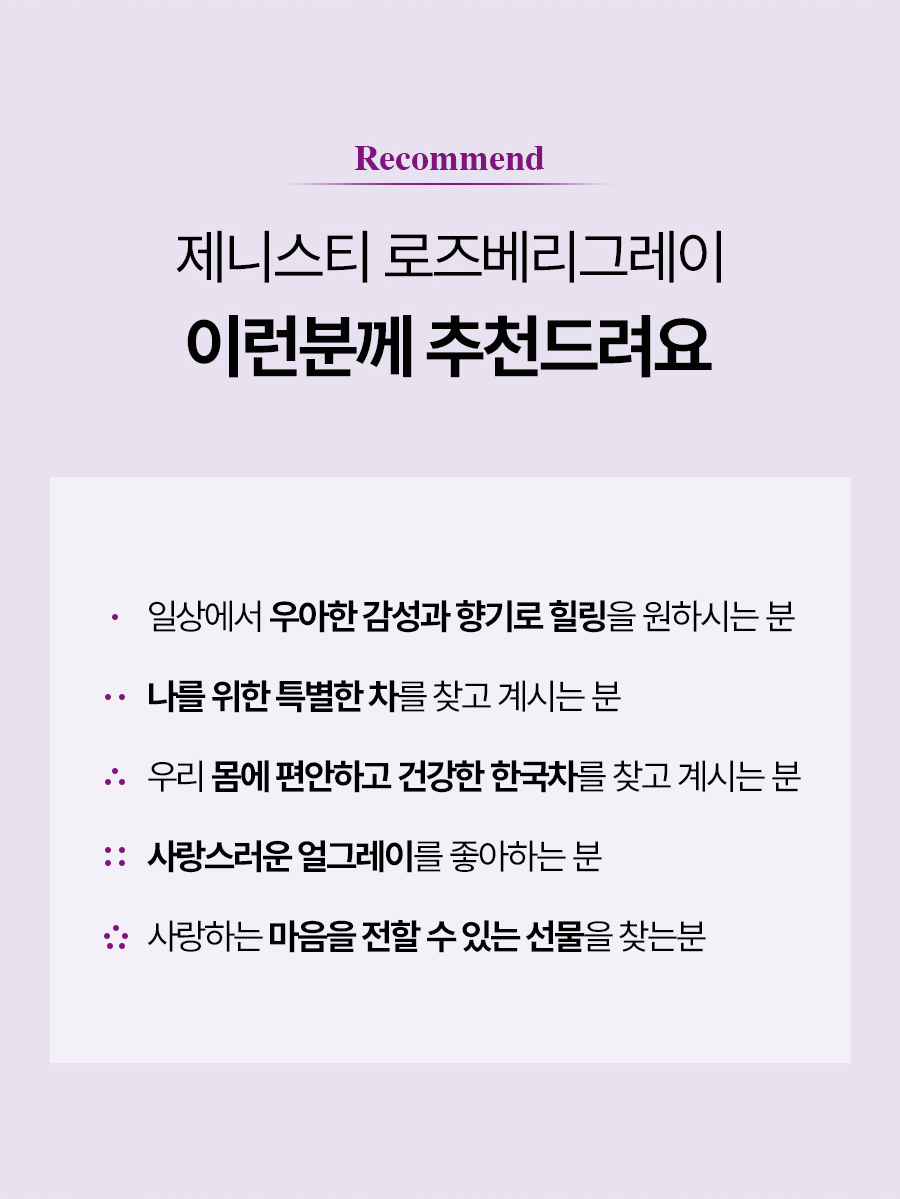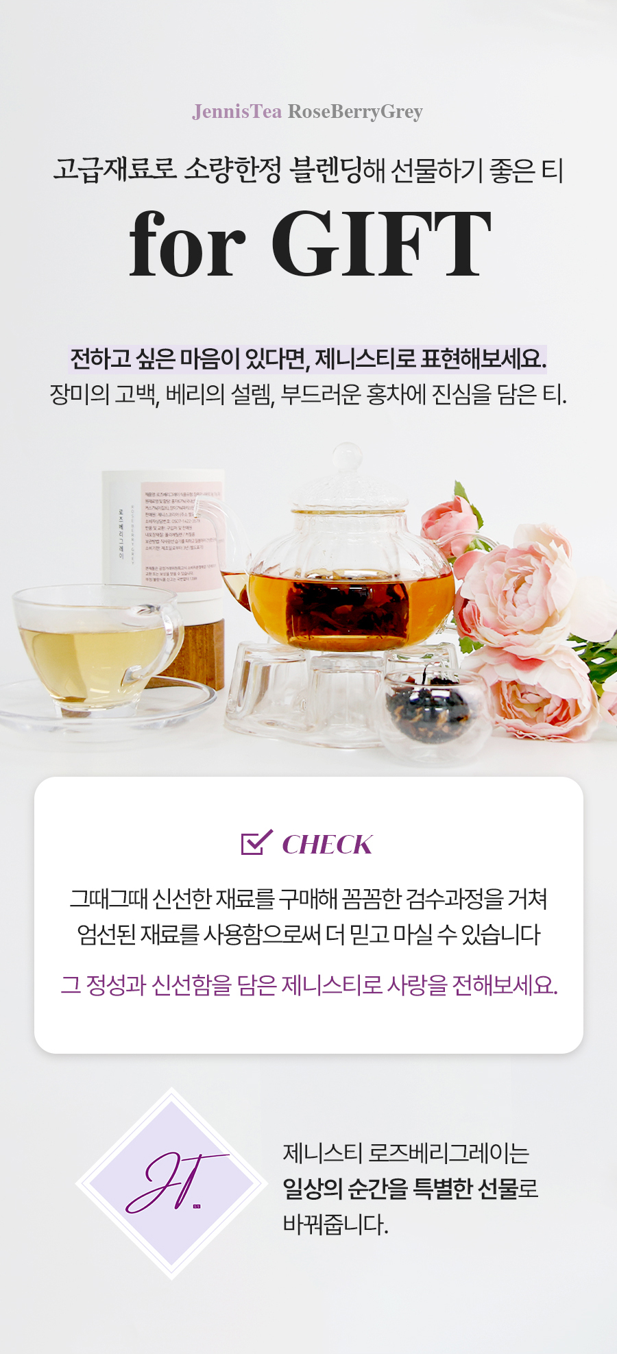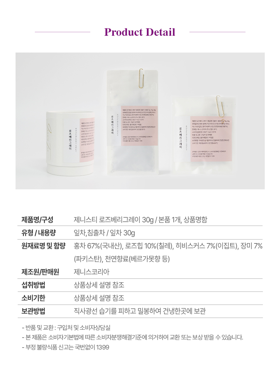 누구나 사랑하는 얼그레이에서 착안하여 만든 블렌딩티로 제니스만의 얼그레이 시리즈가 만들어졌습니다. 그 중 첫번째 로즈베리그레이는 우리나라 청정재배지역인 보성에서 자란 유기농 찻잎으로 만든 홍차를 베이스로 은은한 향의 장미, 새콤달콤함의 히비스커스와 로즈힙이 블렌딩되어 얼그레이스러우면서도 은은 새콤달콤함이 묻어나 그 어느 곳에서도 맛 볼 수 없는 우리나라와 제니스만의 얼그레이 홍차가 되었습니다. 내안의 잊고 있었던 첫사랑의 설렘을 깨워주는 블렌딩티로, 어느 순간 내안에서 서서히 물든 사랑의 시작과 순간을 떠올릴 수 있습니다. |