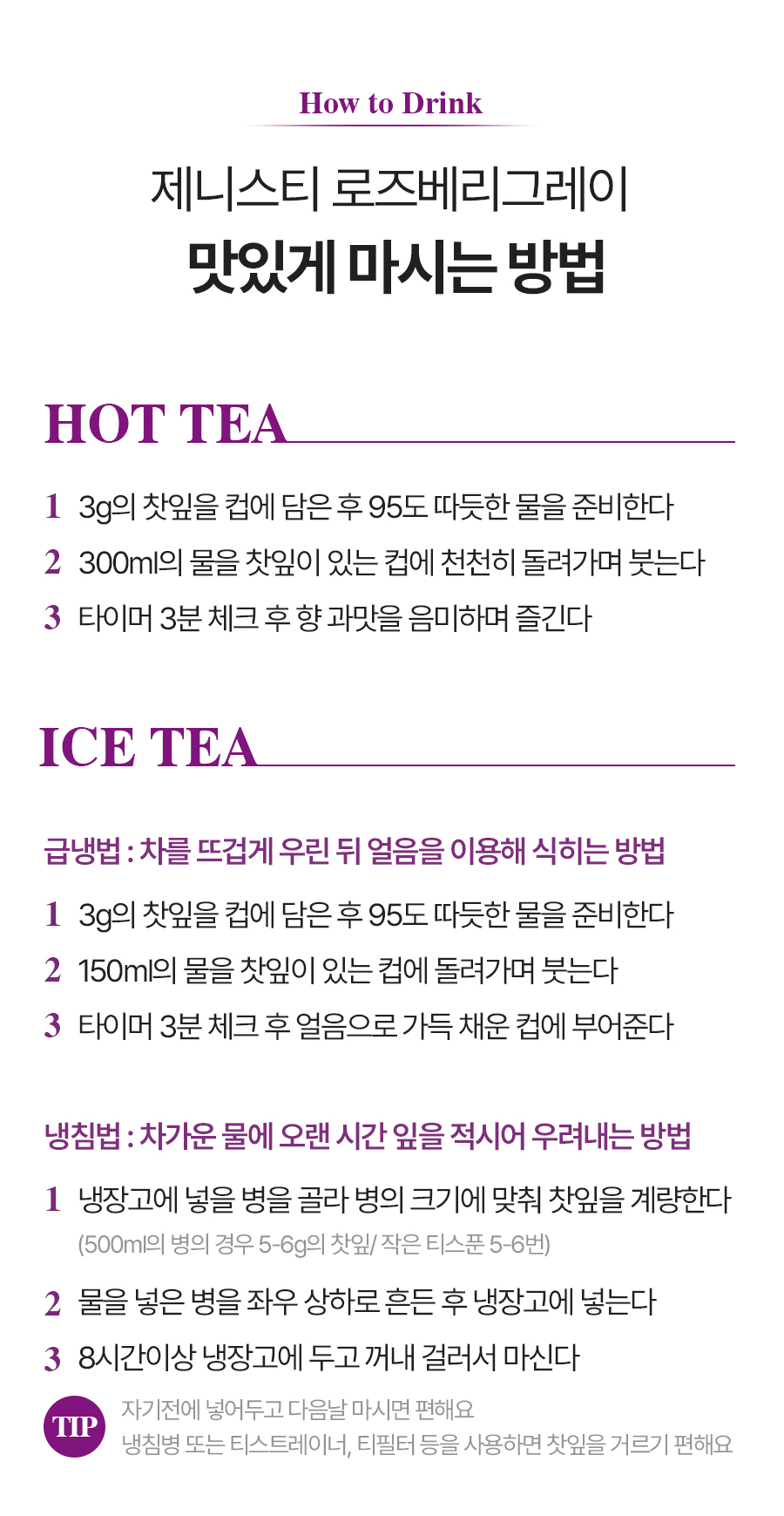 ▣ 따듯하게 마실때 Tip 1) 3g의 찻잎을 컵에 담는다 2) 95도의 따듯한 물 3) 300ml의 물을 찻잎이 있는 컵에 돌려가며 붓는다 4) 타이머 3분 체크! ▣ 아이스로 마실때 Tip 1. 따듯하게 우려 얼음으로 아이스티 1) 3g의 찻잎을 컵에 담는다 2) 95도의 따듯한 물 3) 150ml의 물을 찻잎이 있는 컵에 돌려가며 붓는다 4) 타이머 3분 체크후 얼음으로 가득 채운 컵에 부어준다 2. 냉침하여 아이스티 1) 냉장고에 넣을 병을 하나 골라 병의 크기에 맞춰 찻잎을 계량한다 (예, 500ml 병의 경우 5-6g으로 계량, 티스푼으롤 5번반, 6번반을 넣으면 됩니다) 2) 실온의 물을 병에 붓고 뚜겅을 닫아 병을 좌우로 몇번 흔든후 냉장고에 넣는다 3) 8시간에서 12시간 냉장고에 두고 꺼내 마시면 끝 (냉침병, 티스트레이너나 면티백, 다시마 팩등을 이용하며 찻잎을 걸러내면 편해요) |