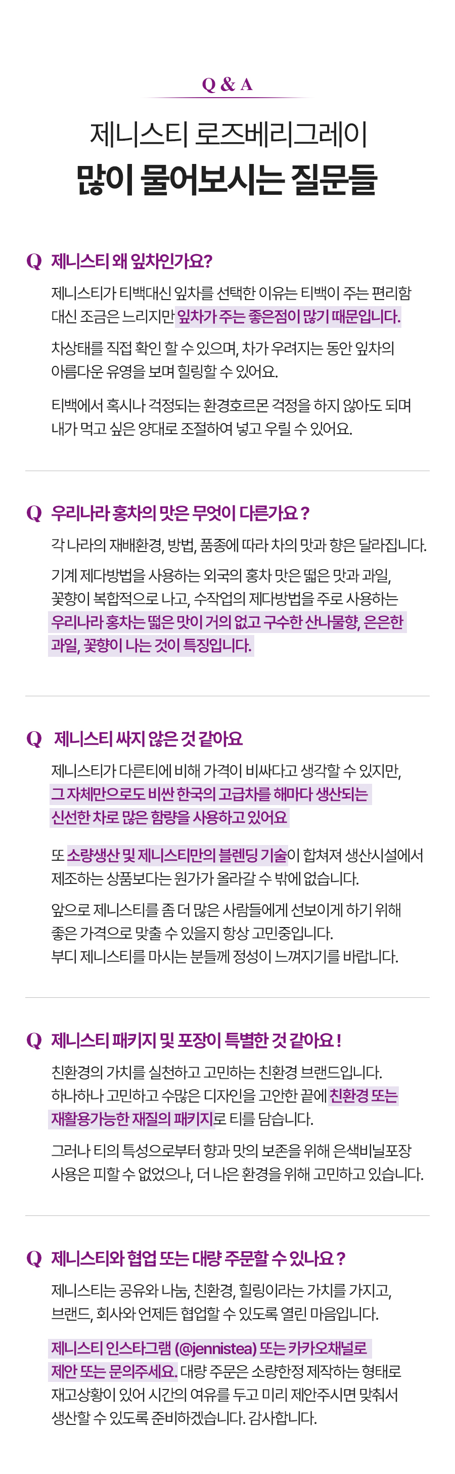 | 차와 재료들은 모두 건조되어 블렌딩에 사용되어 제품으로 유통기한이 지나고 상하거나 못먹는것은 아니나, 최대한의 향미를 지킬수 있는 시간이니 반드시 밀봉하여 가급적 유통기한 내에 드시기를 권장드립니다. |