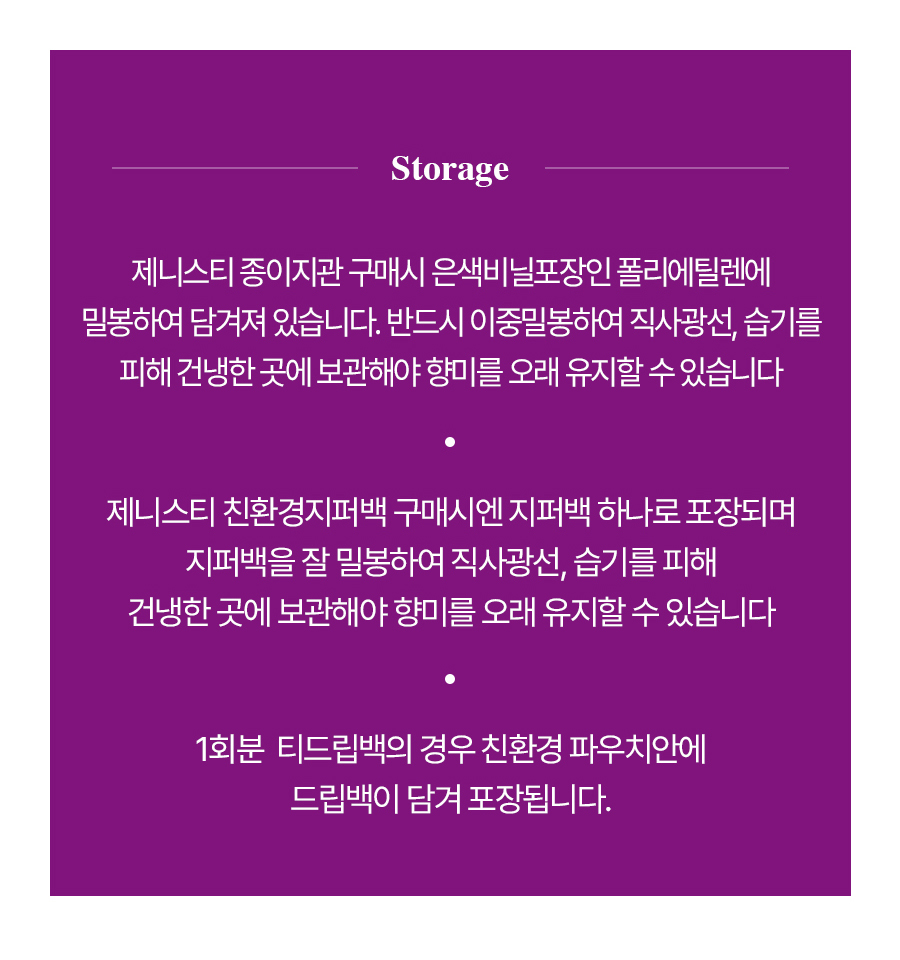 | 1. 지관 또는 친환경지퍼백 선택 없을시에는 지관으로 포장되어 나갑니다. 2. 차를 보관하실때는 직사광선 습기를 피하고 밀봉하여 건냉한곳에 보관하여 향미를 오래 보존하여 드실 수 있습니다. |